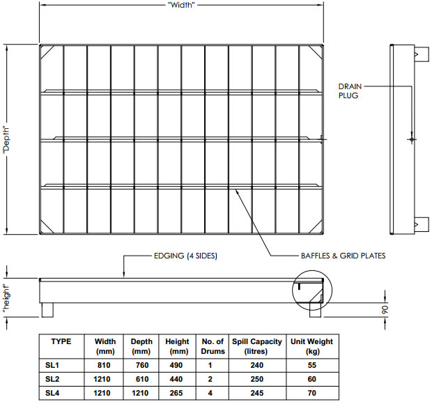 All models have a spill capacity of at least 110% containment of the largest drum in accordance with Australian Standards, being classified as "portable" units.