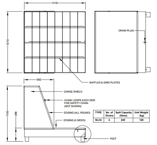 Similar to the type SL Spill Bins, the SLC Spill Bins have the extra advantage of being partly enclosed back and sides with a chain at the front to secure the drums. This type of Spill Bin is available to cater for one (1), two (2) or four (4) drums.