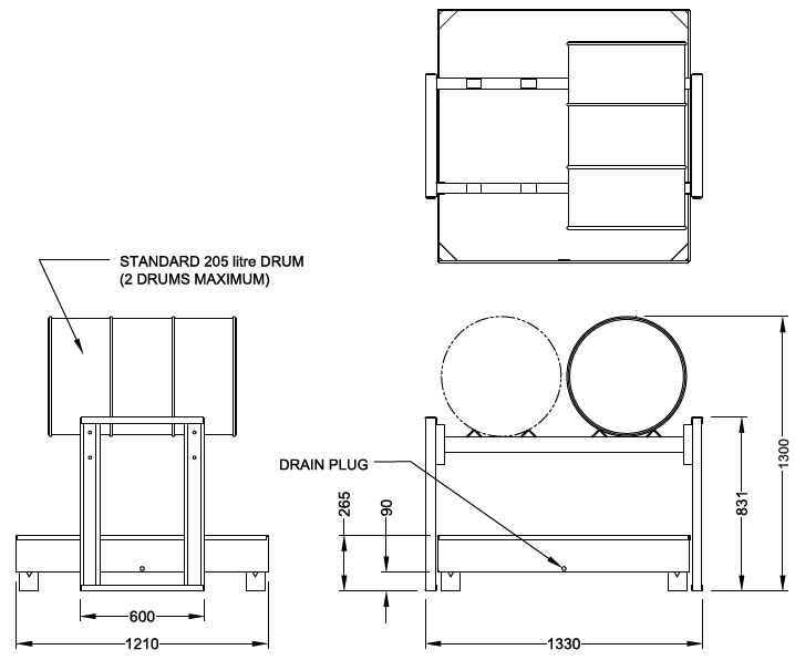 The drum rack tray spill capacity is at least 110% of the largest package in accordance with Australian Standards with this being classified as a portable unit.